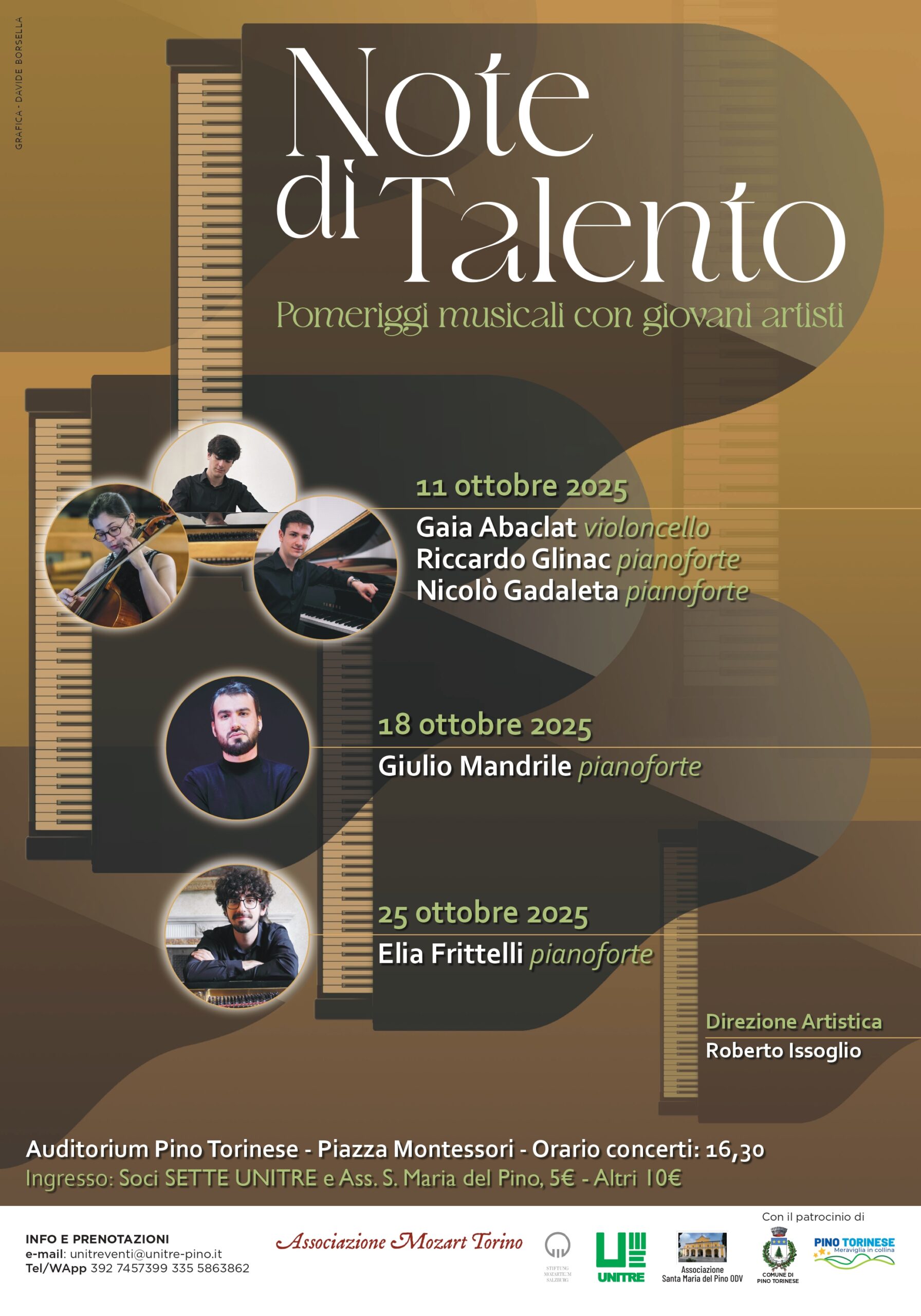 Nel mese di ottobre, a Pino Torinese, arriva “Note di Talento”, la rassegna organizzata dall’Associazione Mozart Torino in collaborazione con l’Unitre Pino Torinese e l’Associazione Santa Maria del Pino, con il patrocinio del Comune di Pino Torinese. La direzione artistica è affidata al Maestro Roberto Issoglio